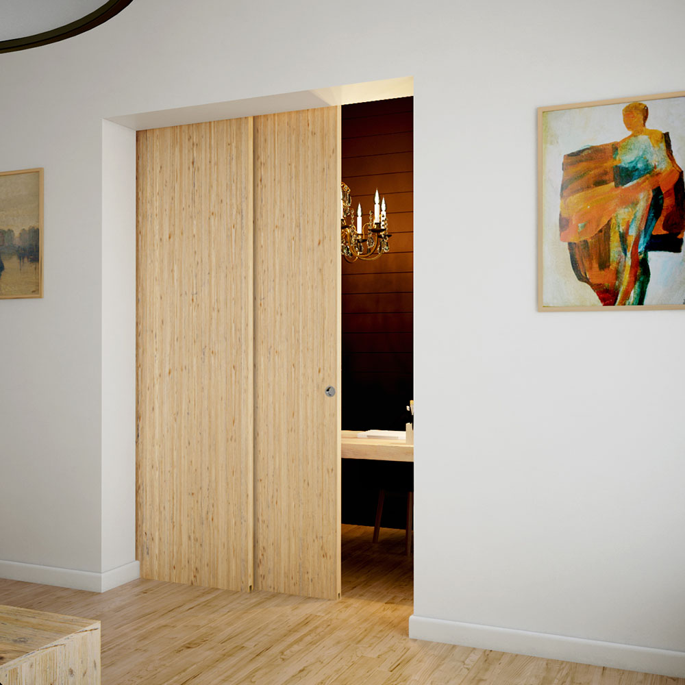 With a pocket door hardware, the door is hidden inside the wall and the wall remains completely clear. The space saving is optimal! To install this type of system, a steel frame or a wooden structure is necessary to make a sliding pocket door. The track is fixed above the door and can support one to two doors thanks to the frames.